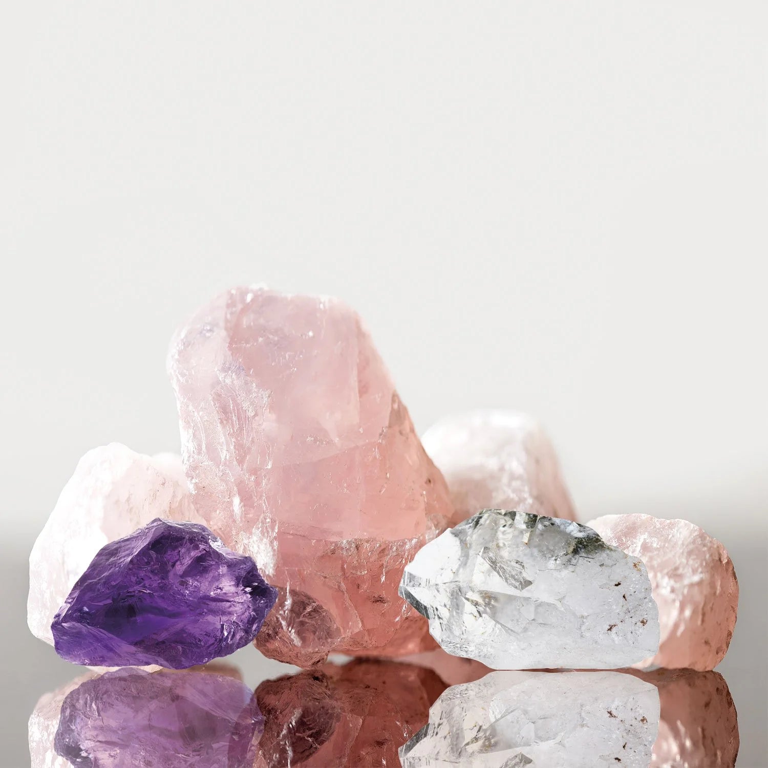 Quarzo rosa, ametista, cristallo di rocca
